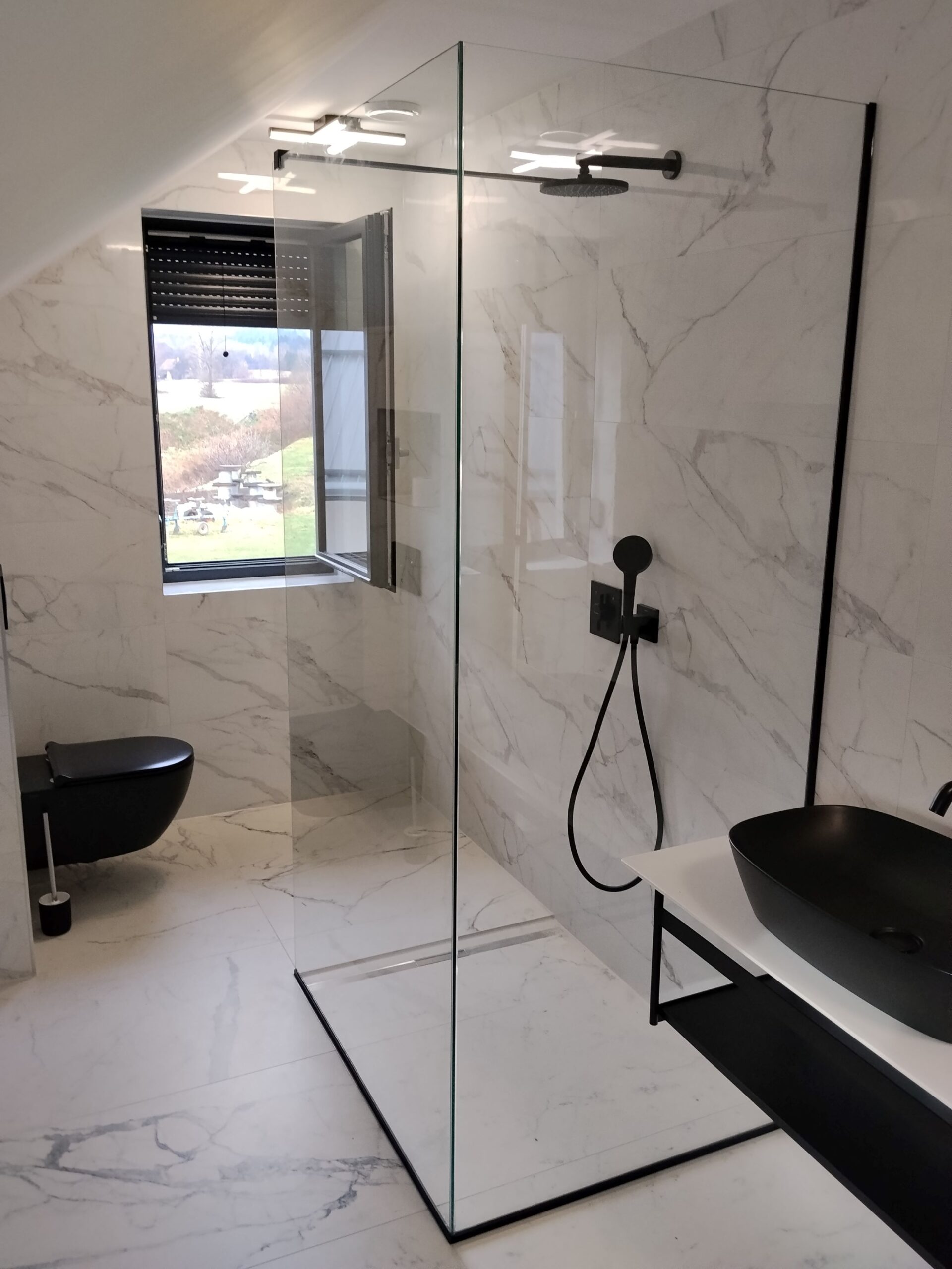 Tuš stene in kabine po meri, z nihajnimi ali drsnimi vrati.